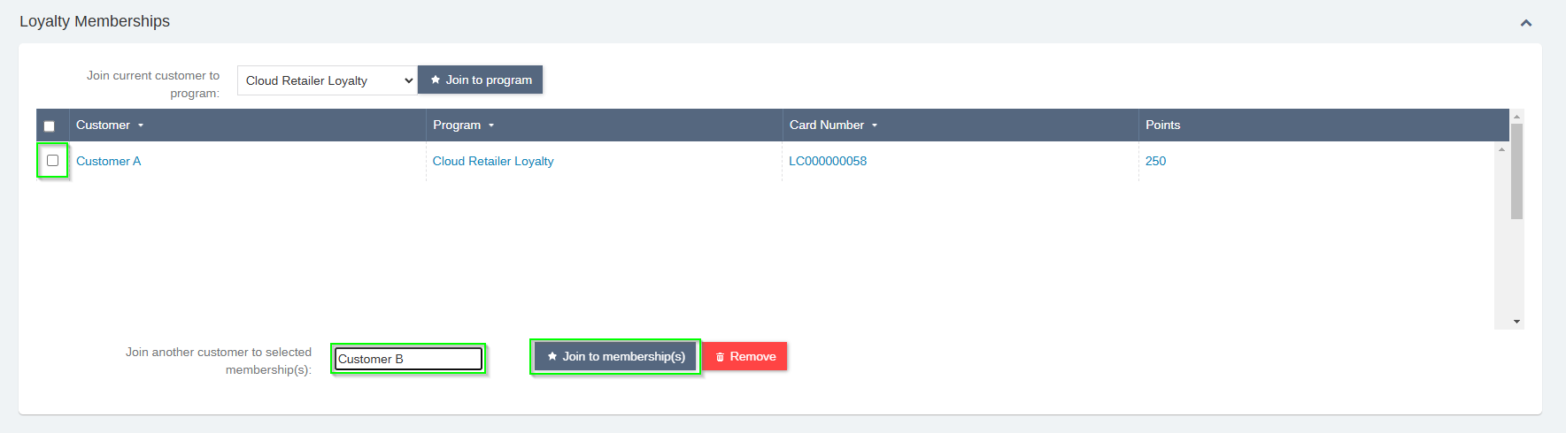Important: The system will not merge existing loyalty accounts. Because of this, you will need to document the points balance for Customer B to apply an equal adjustment to the shared loyalty account. Clicking the "Remove" button in the next step will delete all loyalty data related to Customer B. A new Card Number will be created for Customer B after Customer B is joined to Customer A's