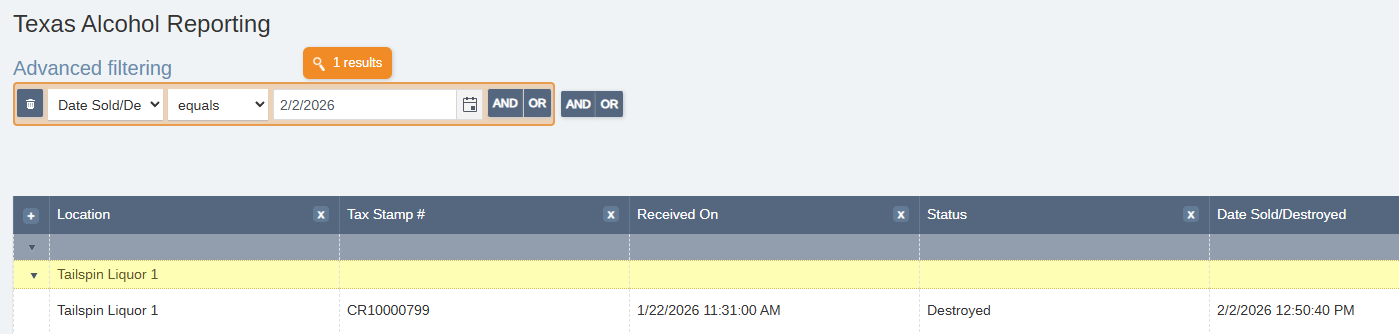 - (Optional) To search by the stamp number, change this filter from Date Sold/Destroyed to Tax Stamp #
