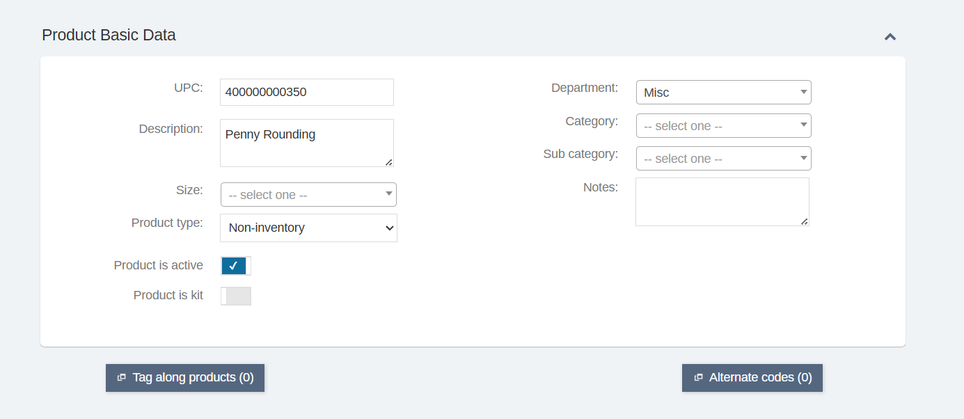 - Double click the UPC field to generate a new code. Copy that code to your clipboard, name it "Penny Rounding", and fill out any fields that make sense for your data. We recommend labeling it "Non-Inventory":