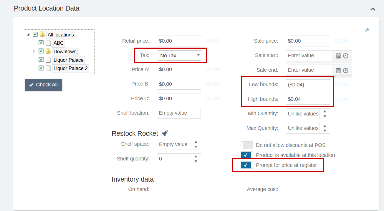 - Scroll down to "Product Location Data" and set the tax to "No Tax", check the "Prompt for price at register" option, and low bounds to -.04, and high bounds to .04. This will prevent cashiers from abusing the rounding.