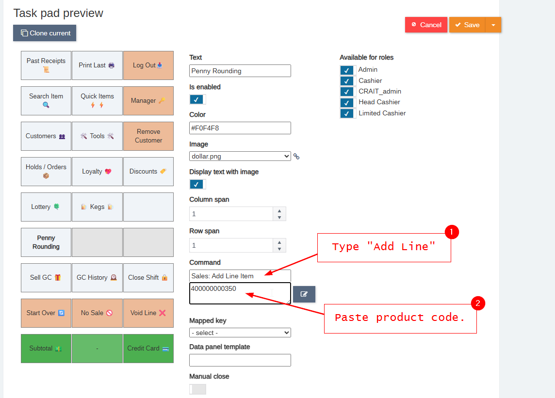 - Add "Penny Rounding" to the text, type "Add Line" in the top part of the command, it should auto-complete the "Sales: Add Line Item" command. In the lower part, paste your Penny Rounding product code. Save the task pad.